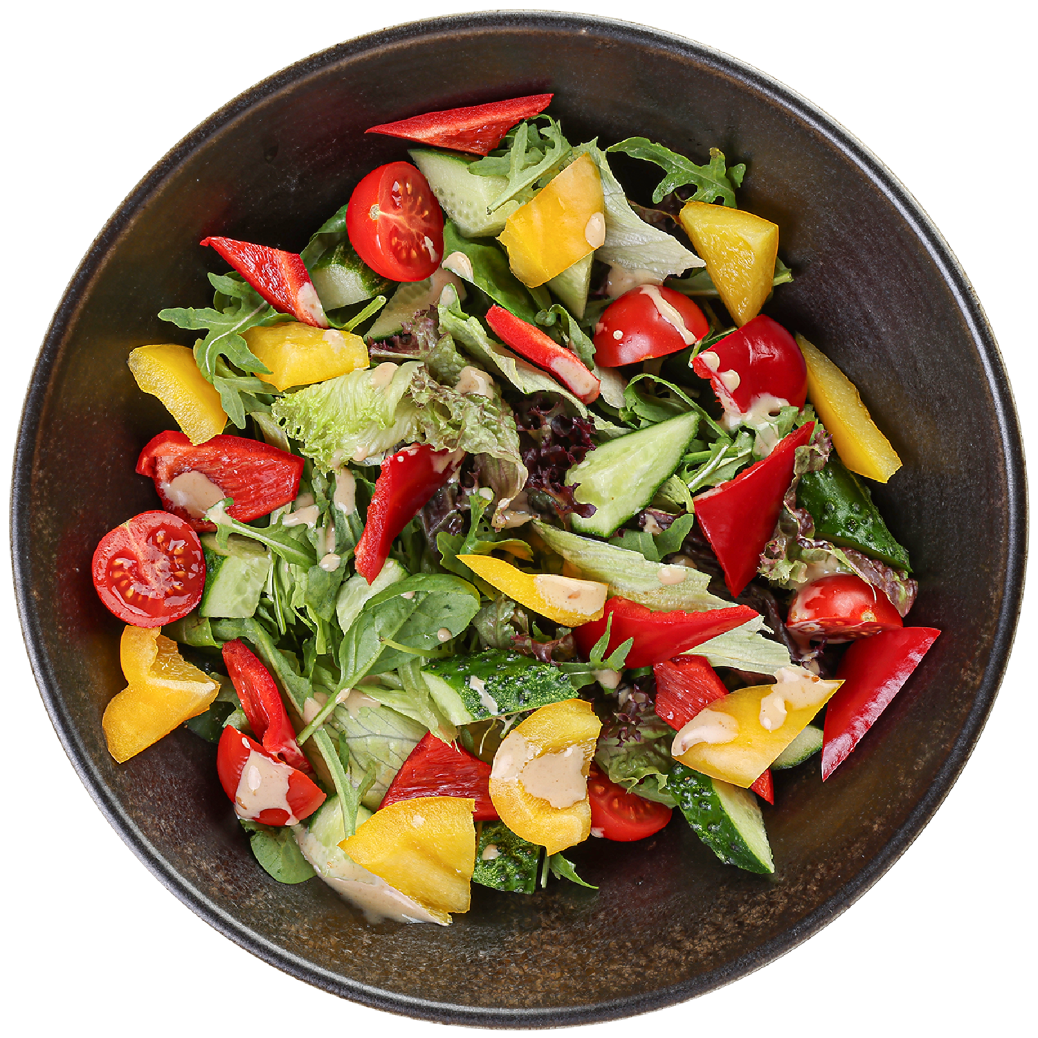 Микс салата, сладкий перец, огурец, помидоры черри, соус ореховый. 260 гр.