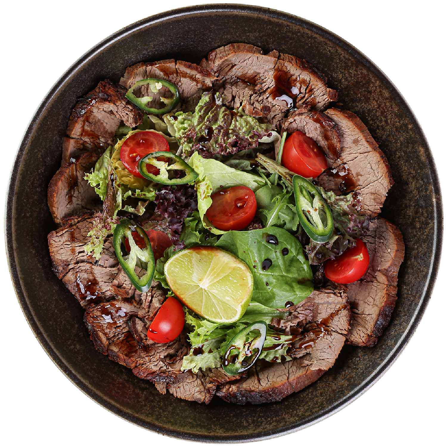 Вырезка телятины, микс салата, помидоры черри, острый перец, лайм. 200 гр.