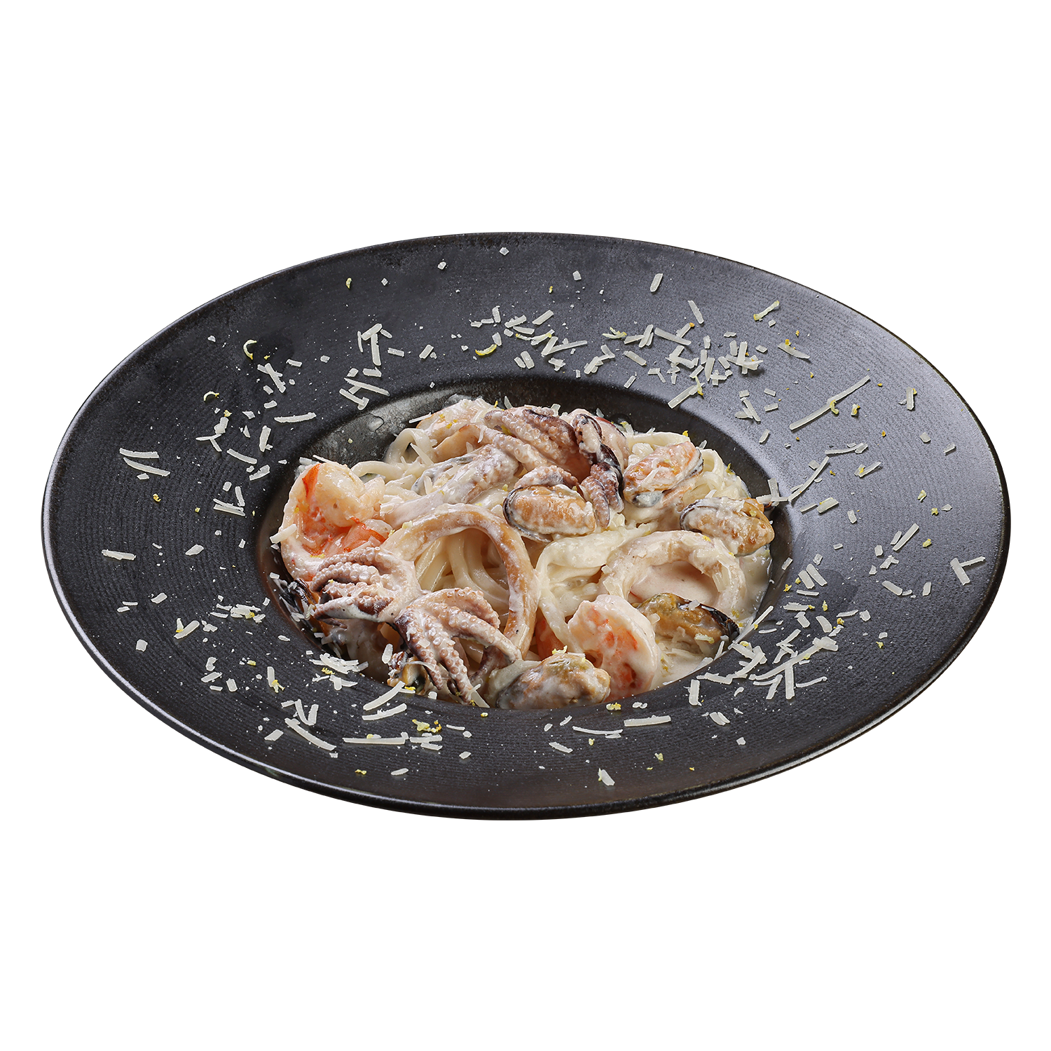 Соба, осьминог мини, креветка, кальмар, мидии, сливки, пармезан.